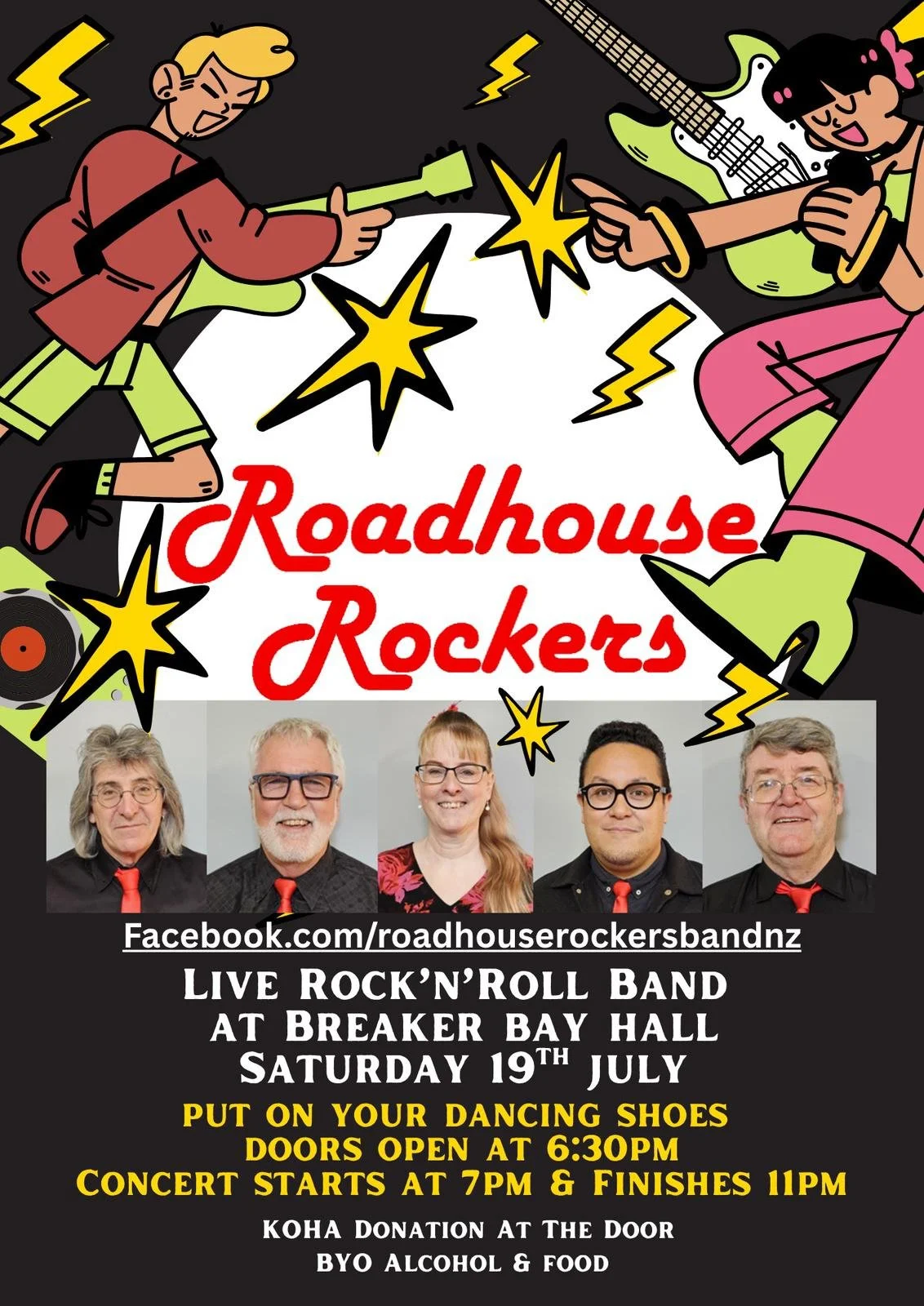 Back to All Events Roadhouse Rockers Saturday, 19 July 2025 7:00 pm 11:00 pm Breaker Bay Hall 150 Breaker Bay Road Wellington, Wellington, 6022 New Zealand (map) Google Calendar ICS Get your dancing shoes on and head on down to Breaker Bay Hall for the Roadhouse Rockers playing all your Rock and Roll favorites. Entry by koha at the door and BYO!